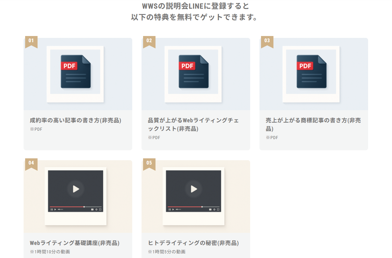 WWS説明会LINEに登録してから入会後までにもらえる無料の特典は以下の5つです。全て非売品でブロガー界の神といわれるヒトデさんの動画も視聴できます。